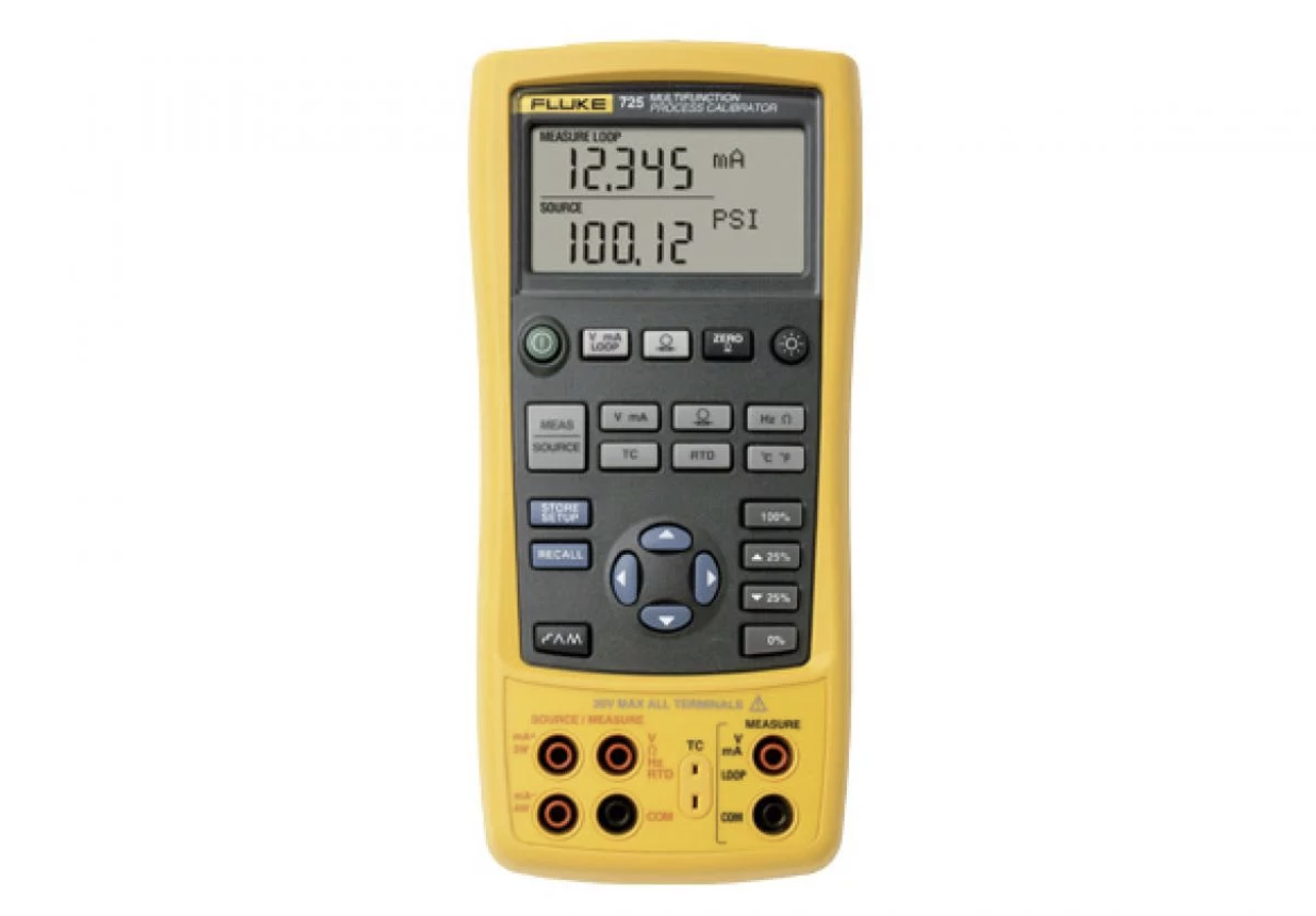 With the Fluke 725 Multifunction Process Calibrator you can easily source and measure almost any process parameter and test almost any process device. Measure and source mA, volts, temperature (RTDs and thermocouples), frequency, ohms, and pressure, using optional pressure modules.