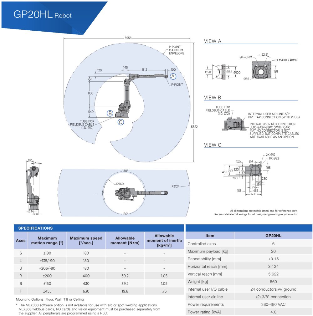 The hollow arm six-axis GP20HL robot offers an extra-long reach for precise performance, optimizing productivity for the handling of larger and heavier payloads. Fast axis speeds and acceleration capabilities decrease cycle time and increase throughput, while the hollow arm offers superb cable protection. The GP20HL provides a reduced interference design for close proximity placement for high-density layouts, and it has a streamlined upper arm, enabling access to parts in tight spaces. A wide wrist motion range, high moment and inertia ratings, and the ability to mount peripheral equipment at multiple locations makes the GP20HL ideal for a variety of tasks.